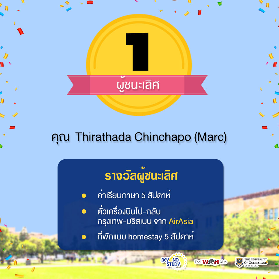 ICTE-UQ สถาบันสอนภาษาจาก University of Queensland มหาวิทยาลัยชื่อดังในออสเตรเลีย ได้มอบทุนเรียนภาษาระยะเวลา 5 สัปดาห์ พร้อมตั๋วเครื่องบินไปกลับ กรุงเทพฯ-บริสเบน ฟรี! 1 ที่นั่ง สำหรับผู้ชนะ ซึ่งการประกวดครั้งนี้ผู้ที่ได้รับรางวัลชนะเลิศได้แก่ ….
