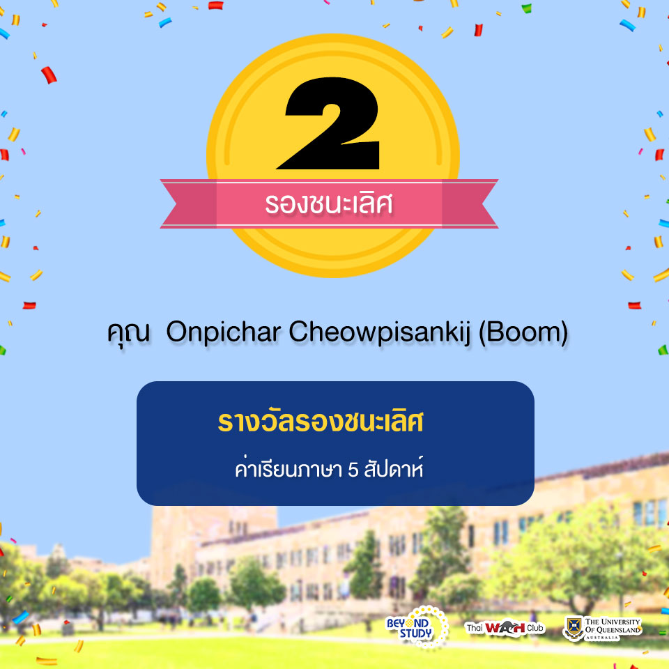 สำหรับผู้ที่ได้รับรางวัลรองชนะเลิศอันดับที่ 1 ได้แก่ คุณ Onpichar Cheowpisankij (Boom) ได้รับรางวัลเป็น ทุนเรียนภาษาระยะเวลา 5 สัปดาห์ที่ ICTE-UQ ประเทศออสเตรเลีย เช่นกันค่ะ